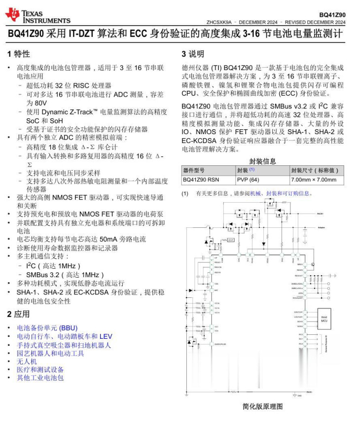 BQ41Z90 是一款面向中大容量电池包与复杂拓扑的高度集成电池包管理器,专为需支持 3–16 串、包电压可达约 80V 的系统而设计。