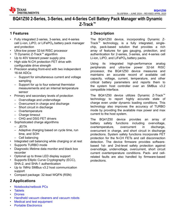 BQ41Z50 是德州仪器为轻薄便携与中小容量电池包设计的一颗高度集成电量计芯片,该芯片把测量前端、能量计量与在线阻抗跟踪算法有效结合,旨在在高动态负载场景下给出更稳定可靠的剩余电量和健康度判断。