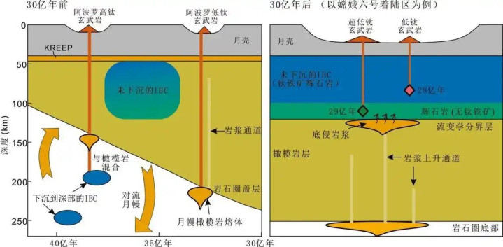 据IT之家了解,研究团队在嫦娥六号样品中发现了两类形成时间相近(约28亿年前和29亿年前),但成分和来源深度迥异的玄武岩。其中一类是源自月幔深处(超过120公里)的“超低钛玄武岩”,另一类是来自较浅的月幔(60公里–80公里)的“低钛玄武岩”。通过模拟月球内部的高温高压环境,研究人员发现,这两类岩石分别来自月球早期岩浆海洋冷却后形成的两种不同岩层:普通的辉石岩层和含钛铁矿的辉石岩层(IBC)。